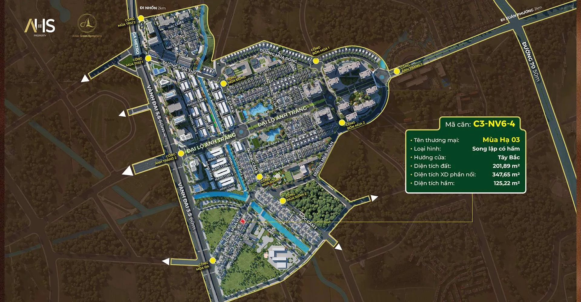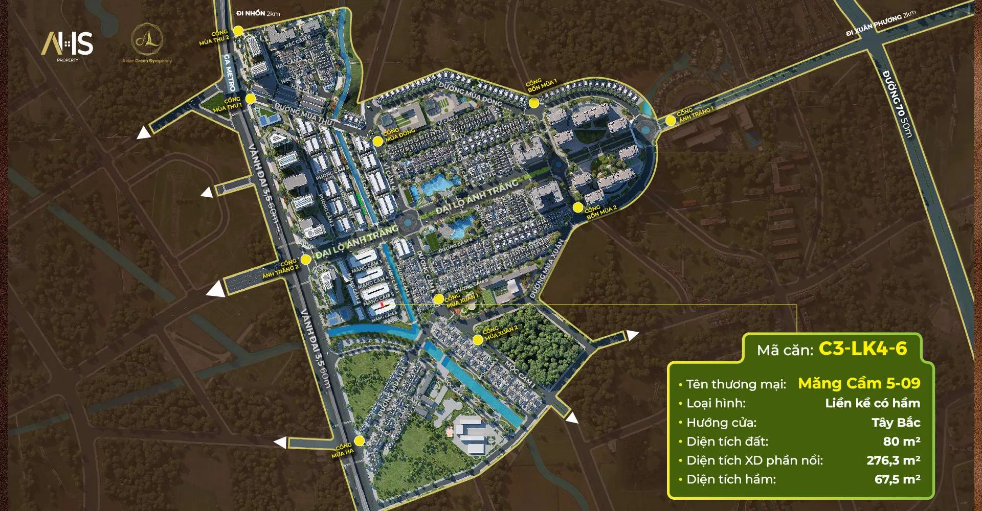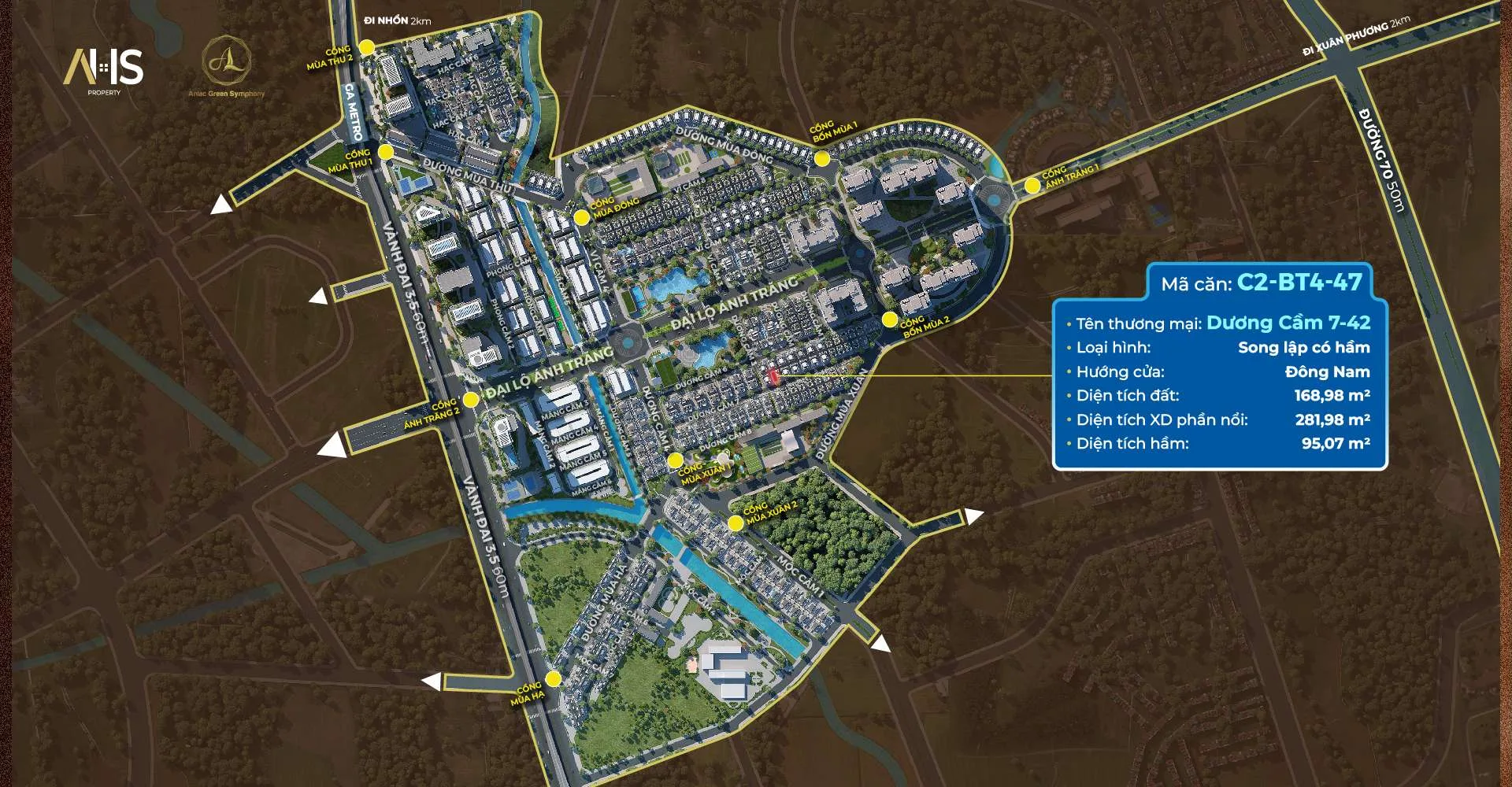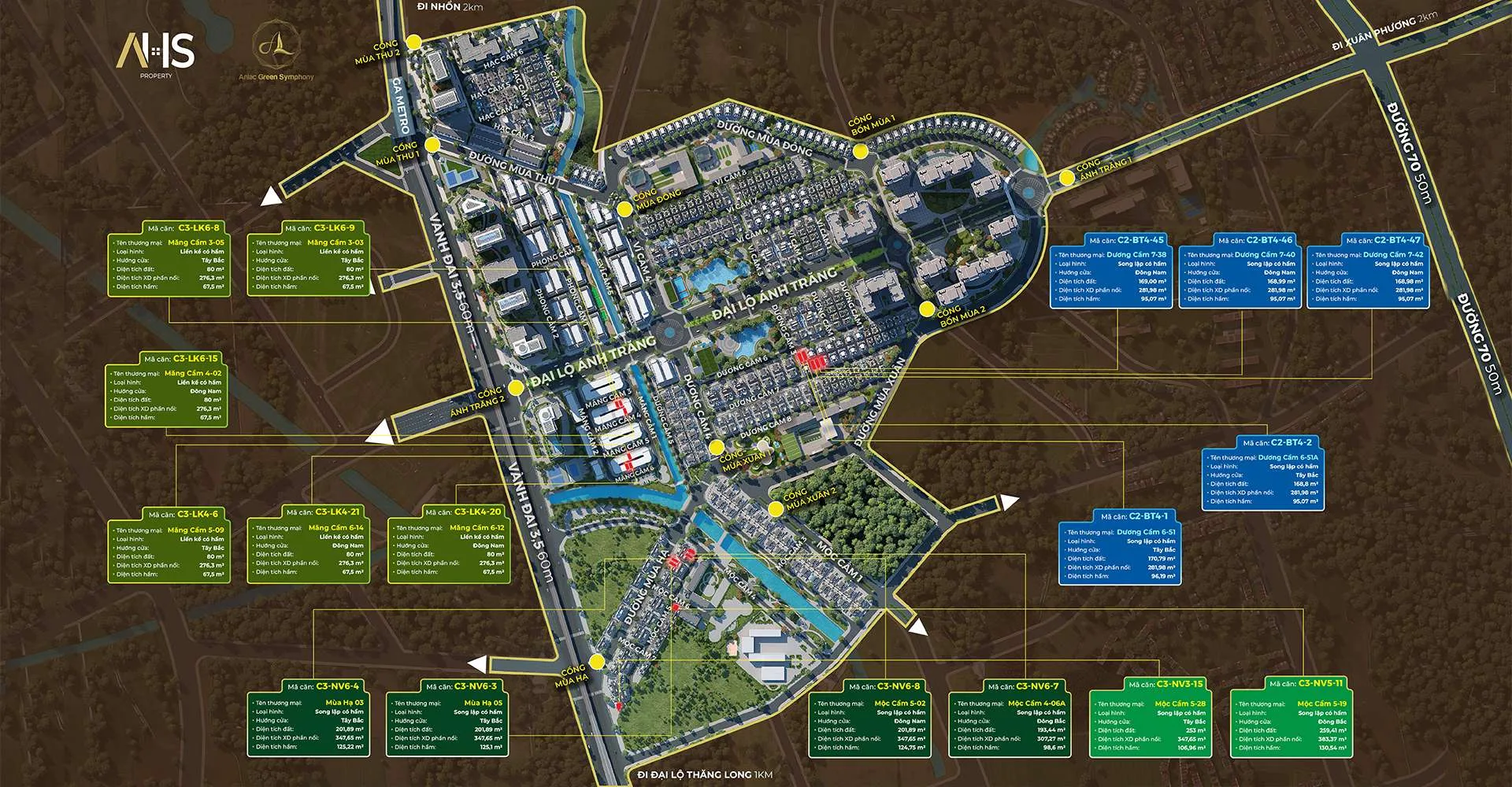 An Lạc Green Symphony có tổng diện tích khoảng 70ha, được quy hoạch đồng bộ với nhiều loại hình sản phẩm đa dạng, bao gồm biệt thự, liền kề, shophouse và chung cư cao tầng.